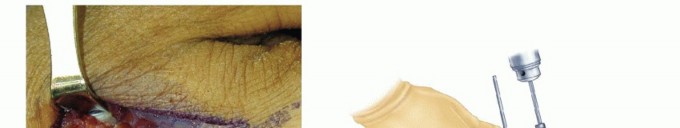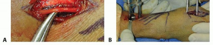 TECH FIG 5 • A. Incision over the radial forearm demonstrating the radial sensory nerve branch deep to the fascia. (The hand is to the right.) B. The double drill guide is placed onto the radius.(continued)