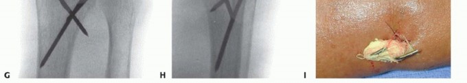 TECH FIG 3 •(continued)D. A pin is inserted retrograde into the radial styloid. E. PA radiograph demonstrating the course of the radial styloid wire. F. Two radial styloid wires and two dorsoulnar wires are in place. G. PA view showing fixation and the path of the wires. H. Lateral view showing fixation and path of wires. I. Pins are bent, cut, and covered above the skin. The pins are cut just beneath the skin, which is closed with a 5-0 nylon suture. Alternatively, the pins are bent and cut and left outside the skin ( TECH FIG 3I). A dressing and splint are then applied.3. Bridging External Fixator Application