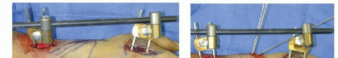 TECH FIG 5 •(continued)C. Final reduction is maintained by the addition of clamps and rods. D. K-wires are used for supplemental fixation when necessary.