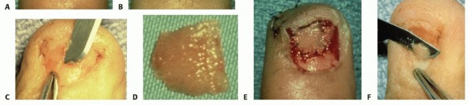 TECH FIG 3 • Treatment of nail bed loss with split nail graft. A. Initial presentation of this nail bed crush injury. B. Available tissue has been repaired, leaving a significant nail matrix defect. Exposed bone is visualized deep to the defect. C. Harvest of split sterile nail matrix graft from toe. D. Harvested split sterile nail matrix graft. E. Graft inset into defect to cover the exposed bone. F. Harvest of germinal matrix from the toe.
