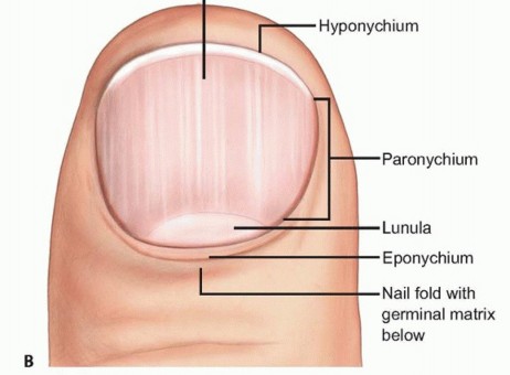- Zook EG, Van Beek AL, Russell RC, et al. Anatomy and physiology of the perionychium: a review of the literature and anatomic study. J Hand Surg Am 1980;5:528-536.