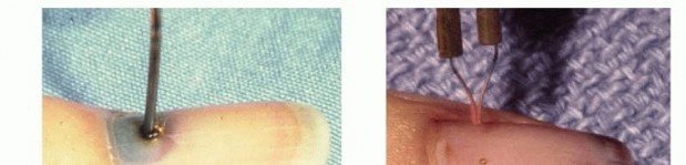 Trephination of the nail can be accomplished using a heated paper clip, needle, or handheld battery-powered cautery (TECH FIG 1).