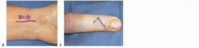 FIG 5 • A. A Brunner incision is made for a volar multilobular mass. B. A dorsal epidermal inclusion cyst is approached through a small longitudinal incision directly over the lesion.