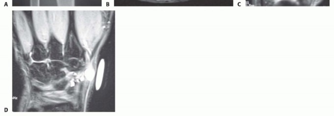 FIG 3 • A. Radiograph showing an intraosseous ganglion cyst within the scaphoid. B. MRI of a dorsal wrist ganglion cyst extending into the scapholunate joint. C. MRI of a ganglion cyst arising from the scaphotrapezial joint and extending into the thenar eminence. D. MRI of a ganglion cyst in the snuffbox but arising from the dorsal scapholunate ligament. MRI can also be used to better localize the site of origin as part of preoperative planning in ganglion cysts that occur in atypical locations (FIG 3C,D).Ultrasound can also be used to diagnose ganglion cysts, but this test is examiner dependent and lesssensitive and specific than MRI.Computed tomography (CT) scans are generally obtained only for preoperative planning to better localize and evaluate the bony architecture of intraosseous ganglion cysts.