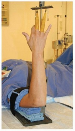 FIG 4 • The patient is positioned supine with an arm board attached to the operating table and the upper extremity is prepared and draped in a standard manner. The surgeon is generally seated in the axilla with full access to the hand and wrist.