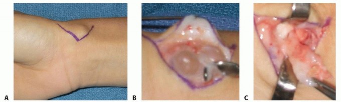 TECH FIG 2 • A. A Brunner type of incision allows for more exposure and avoids contracture associated with straight longitudinal incisions in this location. B. A volar cyst adherent to the radial artery and venae comitantes. C. A volar wrist ganglion stalk arising from the volar radiocarpal ligaments.