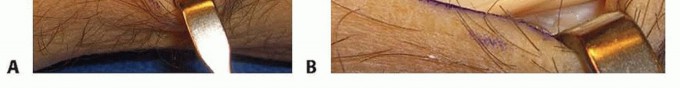 TECH FIG 1 • Open radial styloidectomy. A. A 2- to 3-cm oblique skin incision is made between the first and second extensor compartments. Note the branches of the radial sensory and lateral antebrachial cutaneous nerves. B. The first dorsal compartment is then opened.(continued)