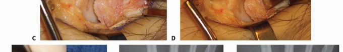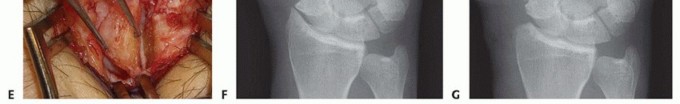 TECH FIG 1 •(continued)C. The radial styloid is extraperiosteally exposed by sharp dissection. D. An osteotome is used to resect the distal 3 to 4 mm of radial styloid. The osteotome should be angled perpendicular to the joint surface. E. The resected radial styloid is removed. F,G. Preoperative and postoperative PA radiographs of the wrist with early SNAC undergoing open radial styloidectomy. (Courtesy of Dr. John J. Fernandez.)
