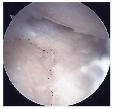 FIG 6• Arthroscopic findings of full-thickness cartilage loss in the entire scaphoid facet (dashed line) and proximal pole of the scaphoid as viewed from the dorsal 3-4 portal. These degenerative changes were not readily apparent on plain radiographs. An isolated radial styloidectomy cannot be expected to confer pain relief in this instance.P.971Alternatively, the hand can be suspended via finger traps using a nonsterile overhead traction boom (ie, an arthroscopic shoulder holder); with this method, the wrist traction tower will not be an impediment to intraoperative fluoroscopic assessment (FIG 7).
