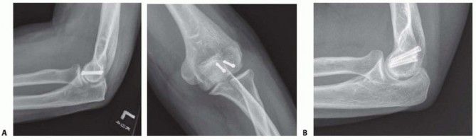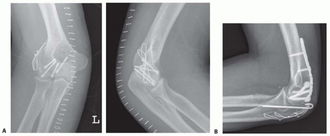 TECH FIG 4 • Postoperative radiographs illustrating (A) repair of the lateral epicondyle and anterior fixation of a capitellar-trochlear shear fracture with multiple headless compression screws. Alternatively, (B) note repair of a different capitellar-trochlear shear fracture using a periarticular locking plate applied to the posterolateral aspect of the distal humerus, facilitated with an olecranon osteotomy.