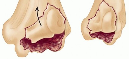 Capitellum and capitellar-trochlear shear fractures involve impaction of the radial head against the lateral column of the distal humerus in a partially extended position, resulting in shearing of the articular cartilage of the distal humerus.Fracture fragments vary in size and displace superiorly and anteriorly into the radial fossa, resulting in impingement with elbow flexion.Associated injuries include proximal and distal radial as well as carpal fractures; ligamentous injuries include collateral ligament (lateral more common than medial) and triceps ruptures. 8