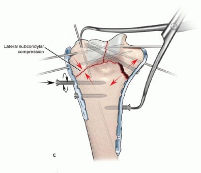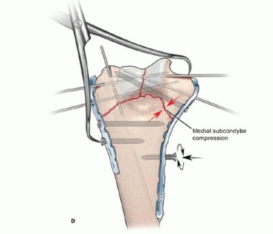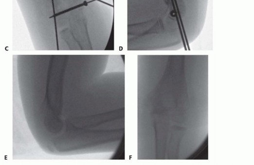 |Visualizing ▪ The C-arm should be brought in prior to draping to assure that adequate imaging the fracture can be obtained intraoperatively. A radiolucent arm board is quite helpful in this||regard.Preoperative ▪ A CT scan or traction x-rays can be helpful preoperatively to assess the degree planning of comminution or presence of coronal split fracture lines which could impedereduction at the time of surgery.Obtaining ▪ The articular block should be reconstructed first; in adolescents, there is the generally less comminution than in adults, so this block can generally bereduction reconstructed into one large fragment. After this fragment is reduced, the articular block can be reduced to the shaft segment.Preventing ▪ The goal of surgery is to provide a stable enough construct that immediate stiffness motion or, at the very least, motion within 3 weeks is possible. Often, adolescentsare nonadherent to self-therapy regimens, and frequent follow-up is necessary to prevent elbow stiffness or need for arthrolysis. Consider a continuous passive motion (CPM) postoperatively. Patients should be advised that usually 10 degrees of extension loss can be expected.Closure ▪ Closure with staples or nylon stitches is advised; remove every other day at 10-14 days. These will allow for wound care with early motion.Follow-up ▪ Follow-up once a week for 4-6 weeks for motion checks. Multiple x-rays are unnecessary, but monitoring the early motion is essential.|------P.78