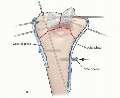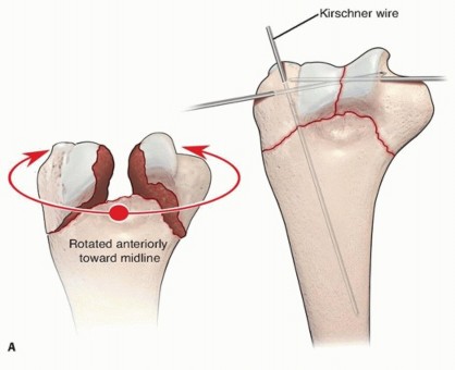 TECH FIG 2 • A. Fragments tend to be rotated anteriorly toward the midline. B. Plates are provisionally held on with Kirschner wires and shaft screws.(continued)