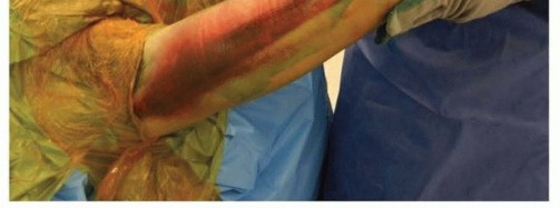 Positioning depends on the planned approach and the surgeon's preference.We prefer the patient supine with the affected extremity brought across the chest over a bump to allow access to the posterolateral elbow.A sterile tourniquet is placed high on the arm.