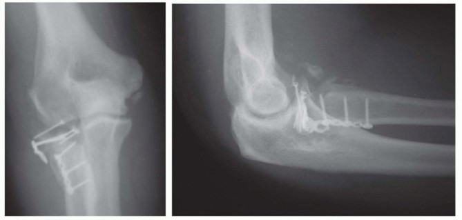 The elbow is immobilized in a splint for 7 to 10 days.Serial x-rays are obtained to detect any loss of reduction at immediate postoperative, 2 weeks, 6 weeks, and 3 months, until healing is achieved ( FIG 12).Active range of motion is allowed as soon as tolerable. Supervised therapy may be considered if the patient is not making adequate progress.Associated injuries may call for more protected range of motion.Light activities of daily living are allowed at 2 weeks, with increased weight bearing at 6 weeks.