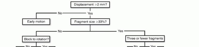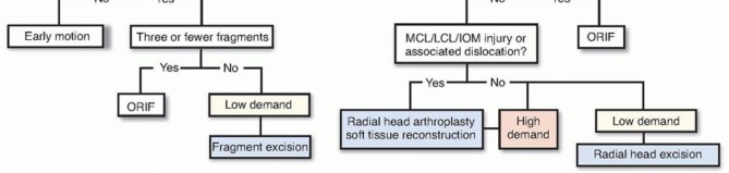FIG 10 • Treatment algorithm for radial head fractures. If there is a blockage or instability, excision, fixation, or arthroplasty is recommended based on patient factors and instability.A recent report regarding the long-term results of nonoperative management (similar to that described) of 49 patients with radial head fractures encompassing over 30% of the joint surface and displaced 2 to 5 mm revealed that 81% of patients had no subjective complaints and minimal loss of motion versus the uninjuredextremity. Only one patient had daily pain. 1