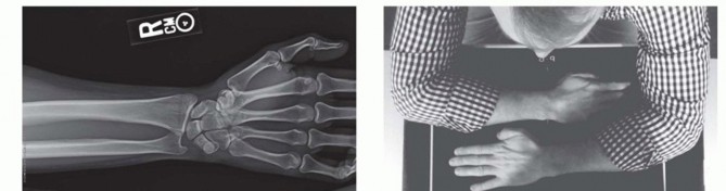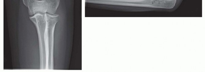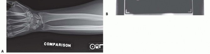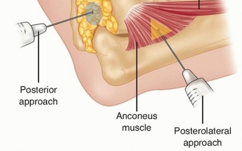 FIG 8 • The elbow joint can be aspirated and injected through the posterior and posterolateral approaches. They are equally effective and should be used based on soft tissue injury. If the examination reveals wrist or forearm tenderness, the examiner should have a low threshold for obtaining bilateral wrist posteroanterior (PA) views to rule out an Essex-Lopresti lesion. Alternatively, this can be done with a one cassette view to minimize radiation exposure ( FIG 9).