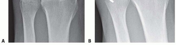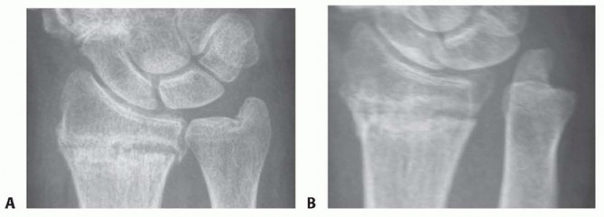 FIG 4 • A. An undisplaced distal radius fracture with no obvious distal ulna pathology. B. The same fracture with a stress test to the DRUJ, and an obvious DRUJ dissociation is seen as a sign of a complete radioulnar ligament detachment in the absence of an ulnar styloid fracture.