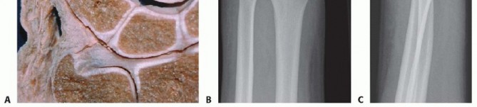 FIG 1 • A. The distal ulna is the fixed point on which performance of most daily hand activities depends. B,C. Fractures of the distal ulna are often neglected in comparison to those of its larger counterpart, the radius, which always attracts attention and treatment efforts. The outcome after distal forearm fractures could be improved if the fixed point—the distal ulna—is addressed surgically at the same time as the radius is operated on.The ligaments run from the fovea of the ulnar head and the base of the ulnar styloid to the dorsal and palmar edges of the sigmoid notch on the distal radius 1,15 (see FIG 2B).
