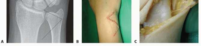 TECH FIG 5 • A,B. AP and lateral radiographs show a dorsally displaced distal forearm fracture. ORIF was performed using both a dorsoradial and a dorsoulnar approach to stabilize the fractures. C. Because of the comminution around the ulnar styloid base, fixation was achieved with a suture loop.6. Comminuted Intra-articular Distal Ulnar FracturesTreatment options exist for comminuted intra-articular distal ulnar fractures:Restoration of the anatomy and overall alignment of the ulna and DRUJ as mentioned earlierThis can be accomplished with manipulation and above-elbow cast immobilization alone or alternatively by surgical means with temporary wiring or external fixation.The potential problems with this management technique are wrist stiffness and reduced forearm rotation that may not be corrected with a late salvage procedure.Primary distal ulnar head replacement 5The theoretical advantage is reduced stiffness (from having early movement) and less DRUJ pain.Total or partial excision of the ulnar head as well as DRUJ arthrodesis with distal ulnar neck resection (Sauvé-Kapandji procedure)Distal ulnar resection with ECU tenodesis (Darrach procedure) 4Care is taken not to resect beyond the proximal portion of the sigmoid notch.