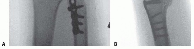 FIG 9 • A,B. AP and lateral radiographs of a Sauvé-Kapandji procedure following traumatic distal ulnar fracture. P.237