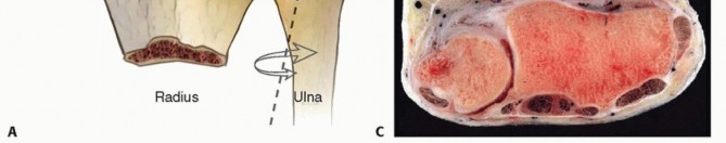 FIG 2 • A. The distal ulna is the fixed point around which the radius rotates in pronation and supination. Through the ulnocarpal ligaments, the distal ulna relates to the hand, allowing daily hand activities. B. The DRUJ is stabilized through the bony congruity between the ulnar head and the sigmoid notch on the radius as well as the dorsal and volar radioulnar ligaments. The radioulnar ligaments include dorsal and volar components that originate on the margins of the sigmoid notch and insert into the fovea and at the base of the ulnar styloid. These ligaments act as reins in the pronation and supination. C. The spheres of the two articular surfaces differ: the ulnar head has a shorter radius of curvature compared with the sigmoid notch.