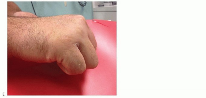 FIG 3 • A. Fracture of the neck of the fifth metacarpal with a flexed, apex dorsal angulation (boxer's fracture). B. Torsional injuries lead to long oblique fractures with a risk for malrotation. C. Short transverse fracture from a direct impact. D. Crush injuries can lead to a combination of injuries with an increased risk of compartment syndrome and significant stiffness. The shortened fourth metacarpal pulls the head of third metacarpal in a proximal and ulnar direction through deep transverse metacarpal ligament. E. Neglected fight bite injury ultimately leading to loss of the metacarpal head. Crush injuries can lead to comminuted fractures with significant soft tissue injuries and a heightened risk of compartment syndrome (FIG 3D).