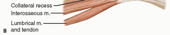 FIG 2 • A. The metacarpals have a triangular shape. The interosseous muscles cover the radial and ulnar surfaces of the metacarpals. The extensor tendons are in close proximity to the dorsal surface. B. The dorsal apparatus covers the MP joint. The extrinsic extensor tendons extend the MP joint and the intrinsic tendons flex it.