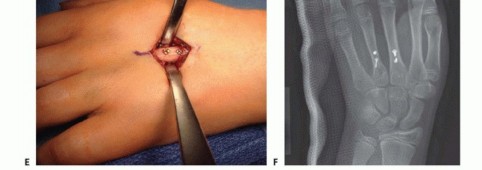 TECH FIG 6 • A,B. Intra-articular head fracture of the fourth metacarpal. C. Dorsal approach to an MP joint. Extensor tendon beneath top retractor. Capsule grabbed by pickup forceps. Articular cartilage seen deep to capsule. D,E. Intra-articular fracture stabilized with headless screws. (continued)