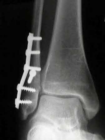 A 23-year-old carpenter fell off a roof 4 weeks ago. He has pain in the ankle and a deformity. The lateral radiograph is presented (Slide). Which of the following treatments is most likely to return this patient to work with a functioning foot and ankle: