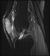 primary right total knee arthroplasty. He states that he had surgery on two occasions for a tendon rupture that was repaired with sutures but that his knee popped again, and now the leg is unable to hold his weight. On examination, he is in no acute distress. His height is 6'3", and he weighs 240 pounds. He is ambulatory with crutches. Range of motion of the right knee is 50° to 120° actively and 0° to 120° passively. More than 10° of varus/valgus laxity and more than 5 mm of anteroposterior drawer are present. A palpable defect is observed in the tissue just proximal to the patella. The incision is well healed. The erythrocyte sedimentation rate is 46 mm/h (reference range 0 to 20 mm/h) and the C-reactive protein level is 2.04 mg/L (reference range 0.08 to