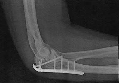 Hak et al review olecranon fracture treatment and state that fragment excision and triceps advancement is most appropriate in elderly, osteoporotic patients with severely comminuted fractures involving the proximal 30-40% of the olecranon.
