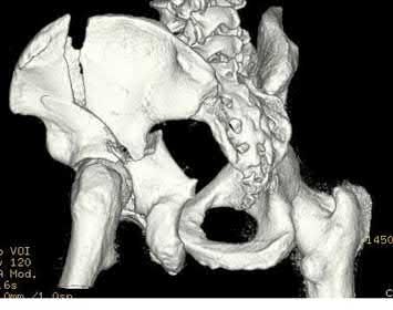 The CT exhibits a posterior wall acetabular fracture, which is fixed via a Kocher-Langenbeck approach. The sciatic nerve, which comes out of the greater sciatic notch, is at the least amount of tension with the hip extended and knee flexed to 90 degrees.