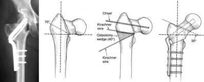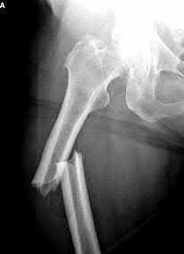 Figure A demonstrates a displaced subtrochanteric femur fracture with an intact lesser trochanter. The pull of iliopsoas on the lesser trochanter as well as the intact external rotators and gluteal musculature results in the the proximal fragment being in a flexed and externally rotated or abducted position (the most common post operative deformity). Reduction manuevers must be biologically friendly but also counteract the flexion/abduction moment. Lundy's review article discusses evaluation and treatment of subtrochanteric fractures. The review article details the various implants often used which include 95 degrees plates, femoral reconstruction nails, or trochanteric femoral nails with interlocking options. Lundy's article discourages the use of the 135 degree screw and side plate combo due to high failure rates in these fracture patterns. Bedi et al also review treatment of these fractures and discuss common