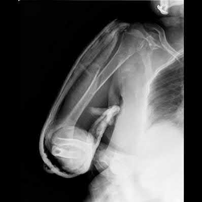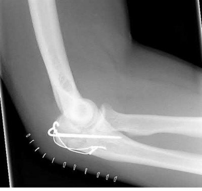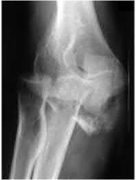 Trans-olecranon fracture dislocations often occur in the young secondary to high energy mechanisms. Direct blows often lead to high levels of comminution; the distal humerus is driven into the proximal ulna and olecranon, thereby leading to a concomitant dislocation. In this setting, the optimal treatment is use of a plate and screw fixation construct to provide mechanical stability.