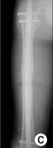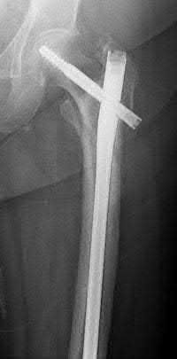 Figure A shows a proximal third femoral shaft fracture that was treated with intramedullary nailing. The oblique fracture line remains evident with a small callus response at the fracture site at 8 months post-operative. Figure B shows an radiograph of the exchange femoral nail 7 months after revision sugary.
