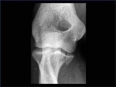 Figures A and B show the AP and lateral radiographs of a trans-olecranon fracture dislocation of the elbow. Severe comminution of the olecranon can be seen on the lateral radiograph in Figure B.