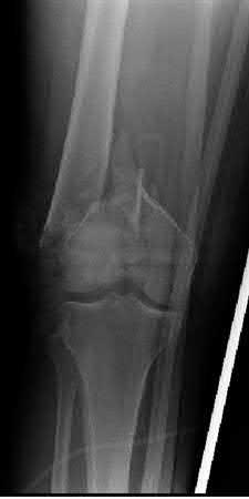 The clinical scenario and radiograph demonstrate a proximal tibia fracture amenable to intramedullary nail fixation. The suprapatellar nailing technique helps prevent apex anterior or procurvatum deformity typical of these injuries.