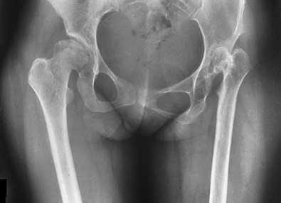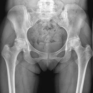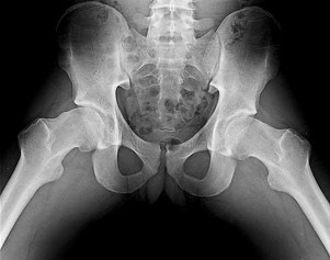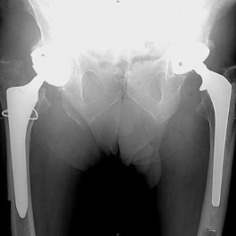 The radiograph shown is consistent with Paget disease of the bone. It demonstrates classic findings of widened lamellae and disorganized sclerotic and lytic areas. The cause is not clearly defined, but may be linked to a viral infection and subsequent alterations of osteoblastic and osteoclastic activity. Most patients are asymptomatic, and Paget disease is often found incidentally on radiographs. In this case, the patient’s symptoms likely were caused by hip arthritis, but Paget disease can cause diffuse bone pain in some cases. Considering the patient’s mild and short-term symptoms, observation and NSAID use is most appropriate. An MRI scan or biopsy is indicated if sarcomatous transformation is suspected, but this condition is rare and is associated with a substantial, unrelenting increase in pain. SPEP and UPEP are tests for multiple myeloma, of which the radiographs show no signs.
