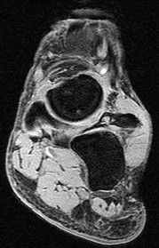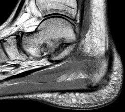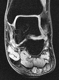 Figure 2a shows an irregularity of the anterior calcaneus. Figure 2b shows TB, AE, and MF. Figure 2c is an oblique view and shows nothing specific. Figure 2d shows an MF. Figure 2e shows an AE. Figures 2f, 2g, and 2h show edema and an abnormal connection between the calcaneus and the navicular, all consistent with a CN coalition.