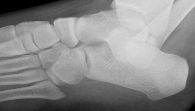 A 15-year-old girl is thrown from a snowmobile and has severe left foot and ankle pain. Her CT image is shown in Figure 96a, and a lateral radiograph is shown in Figure 96b. The arrow in Figure 96a points to which structure?
