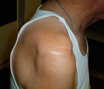 The axillary nerve supplies innervation to the deltoid muscle; this image shows atrophy of this muscle. It arises from the posterior cord of the brachial plexus, coursing on the anterior surface of the subscapularis and then traveling inferior to the glenohumeral joint capsule and coursing from posterior to anterior on the deep surface of the deltoid muscle. Deltoid atrophy