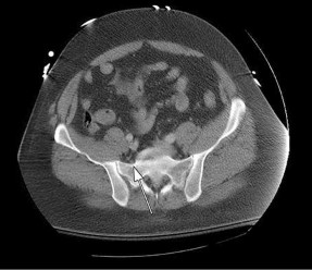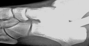 The image shown is a transverse cut of the foot, which shows the inferior calcaneus, the cuboid, and the three cuneiform bones. The arrow points to a fractured cuboid. The lateral radiograph also shows fractures of the anterior process of the calcaneus and the lateral process of the talus.