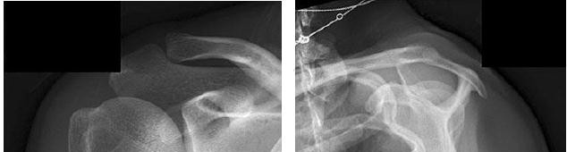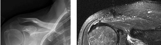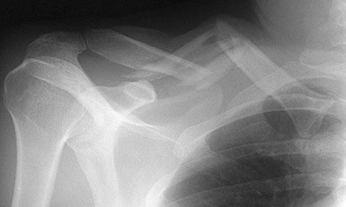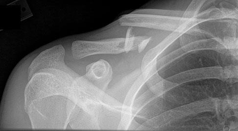 DISCUSSION..The radiographs reveal an atrophic nonunion of the midshaft of the clavicle. The treatment of acute, displaced midshaft clavicle fractures in adults continues to evolve, with several reports advocating early surgical intervention. Although many fractures heal, symptomatic delayed unions or nonunions occur and may eventually require treatment. In this case, further sling immobilization or use of a figure-of-8 brace is unlikely to lead to fracture consolidation at 8 months after the injury. Although use of an electrical bone stimulator may be attractive, there is no conclusive data suggesting its efficacy in promoting healing of a displaced clavicular nonunion.