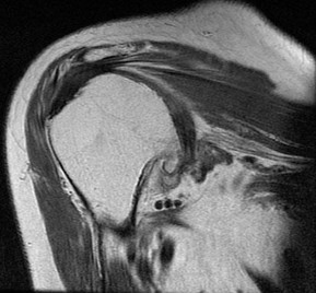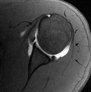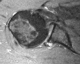 DISCUSSION…The radiographs show a calcium deposit in the supraspinatus tendon. The MRI scan shows a small black signal in the supraspinatus tendon without a tear of the tendon. These findings are consistent with calcific tendonitis. A subacromial injection will help distinguish between the pain from the calcific tendonitis and the chronic fibromyalgia. Pain management is an option after an injection is done for diagnostic purposes. Surgery should not be considered until the diagnosis is confirmed because it will not be successful if the shoulder pain is attributable to the patient’s fibromyalgia.