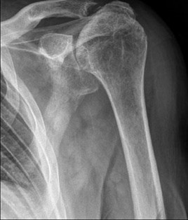 ..Figure 99a is the radiograph of a 48-year-old woman 8 months after initial treatment of an injury. She initially was placed in a sling and progressive rehabilitation followed. She now has refractory pain but normal range of movement and strength. The current radiograph is shown in Figure 99b. The most appropriate next treatment step is
