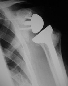 Figure 94 is the anteroposterior radiograph of a 75-year-old woman who has a 5-year history of progressive pain, crepitus, and loss of motion in her shoulder. She had a rotator cuff repair 10 years ago. Examination reveals 60 degrees of active forward elevation and 20 degrees of external rotation with her arm at her side. Passively she can be brought to 160 degrees of forward elevation and 90 degrees of external rotation with her arm at her side. A glenohumeral joint injection with local anesthetic eliminated pain, but there is no observed change in active motion.