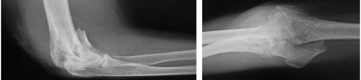DISCUSSION..Patients with elbow osteoarthritis tend to be active and are often involved in manual occupations that place greater demands on a total elbow implant. Such patients are most often treated with nonprosthetic options because of concerns about prosthetic longevity. As a result, few cases of primary osteoarthritis are included in published studies. However, complications such as stem fracture and aseptic loosening appear to be more common in this population than in any other subgroup, including revision patients. The poor soft-tissue quality associated with rheumatoid arthritis leads to a high-risk ligamentous attenuation and is a general contraindication to use of an unlinked implant. The same poor soft tissue leads to a higher rate of triceps insufficiency and wound dehiscence.