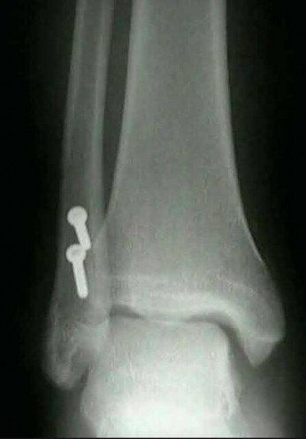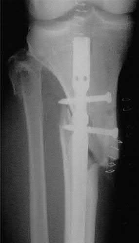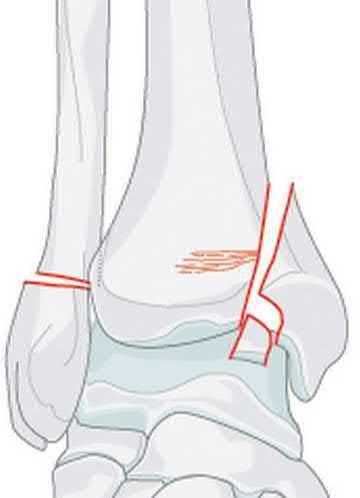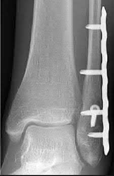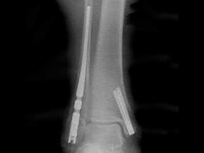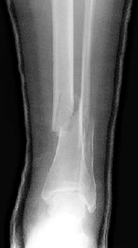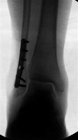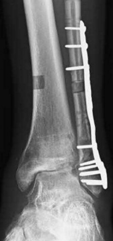 In the distal tibial metaphysis, there is no snug endosteal fit for an IM nail. Center-center nail placement in both proximal and distal fragments is necessary to maintain alignment. There is also increased stress on distal locking bolts to maintain fracture alignment. Assuming static medial-lateral distal locking screws, accurate coronal plane and rotational alignment is achieved by fibular plating as a first step. This also prevents late loss of alignment because of distal locking screw toggle. Reamed nailing allows a stiffer, larger nail to be placed, and allows redistribution of endosteal osteogenic material to the fracture site. Although there is endosteal vascular compromise, this does not affect fracture healing because of intact periosteal supply.