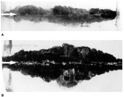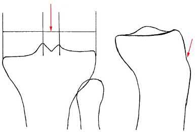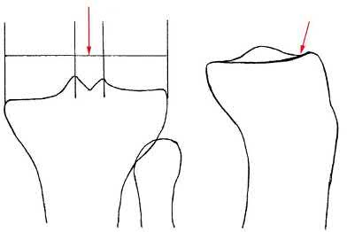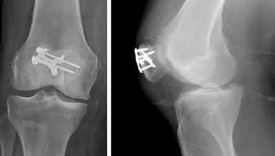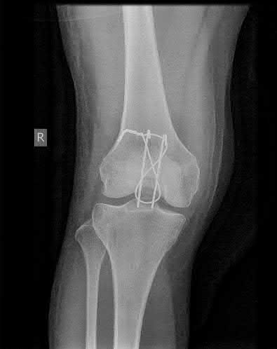 Figures A and B show the post-operative films of a cannulated-screw tension band construct with a check-rein wire inserted in the tibial tubercle. Illustration A shows an example of a K-wire tension band construct used to treat a comminuted patella fracture.